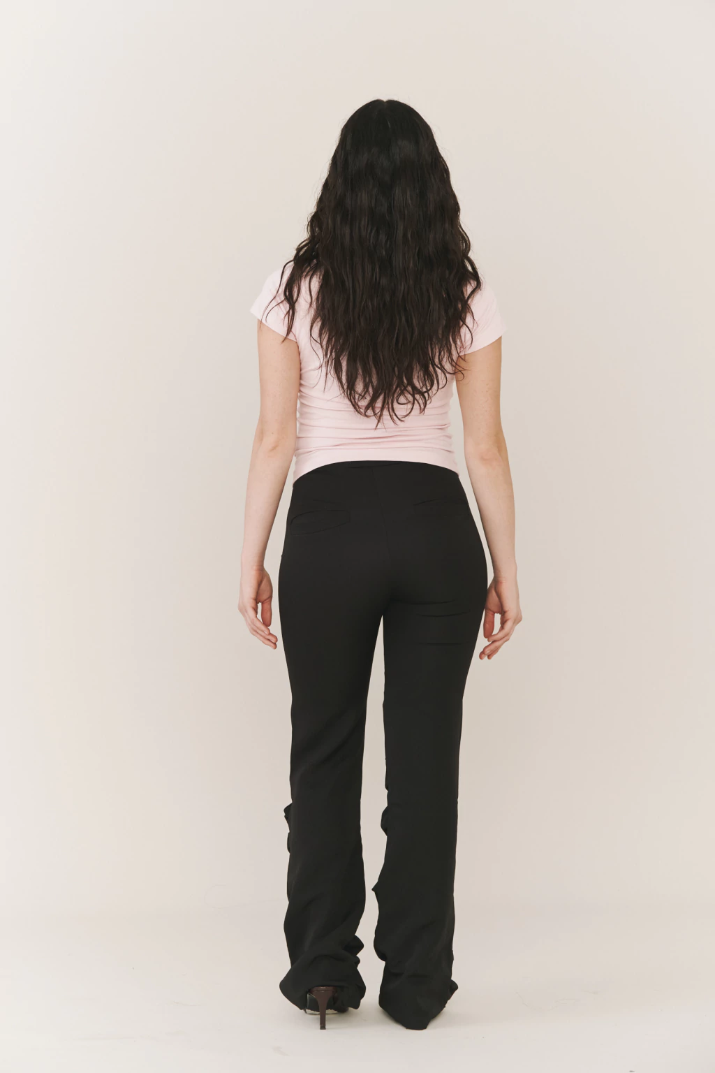 Pantalón sastrero tipo bootcut con acceso en delantero mediante cierre y gancho invisible. Calce al cuerpo hasta la altura de las rodillas delanteras en donde comienza el efecto fruncido que le brindan movimiento y estilo sin perder la elegancia.